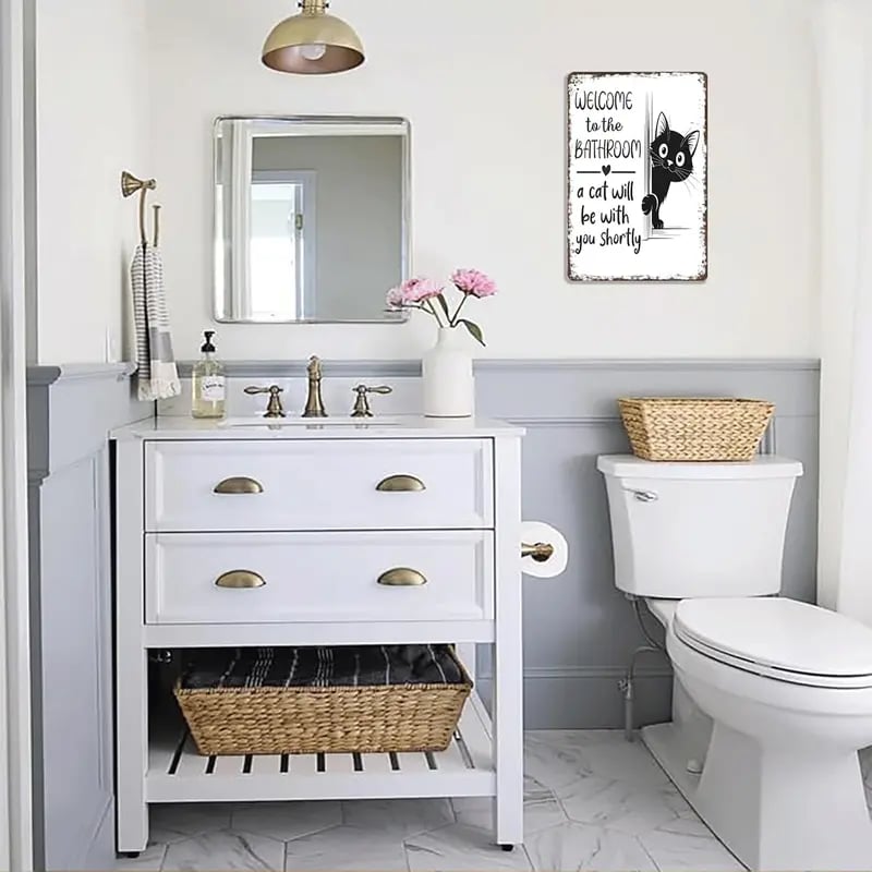 Transform your boring bathroom into a warm and entertaining space. The playful message "Welcome to the bathroom—a cat will be right with you" combined with an adorable cat peeking around the corner adds instant charm and humor. It's a friendly reminder that when you have a cat, you're never really alone—not even in the bathroom.